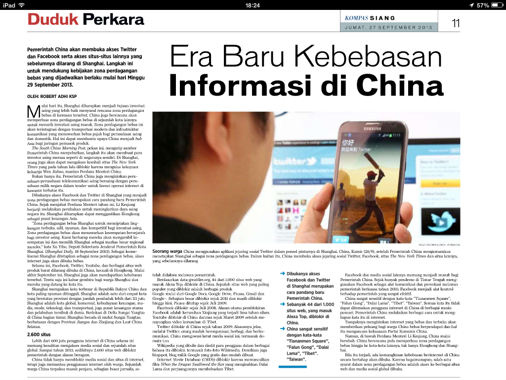 Selama ini, Facebook, Twitter, Youtube, dan berbagai situs web produk barat dilarang dibuka di China, kecuali di Hongkong. Mulai akhir September ini, Shanghai juga akan mendapatkan kebebasan tersebut. Tentu saja ini kabar gembira bagi warga Shanghai dan mereka yang datang ke kota itu.