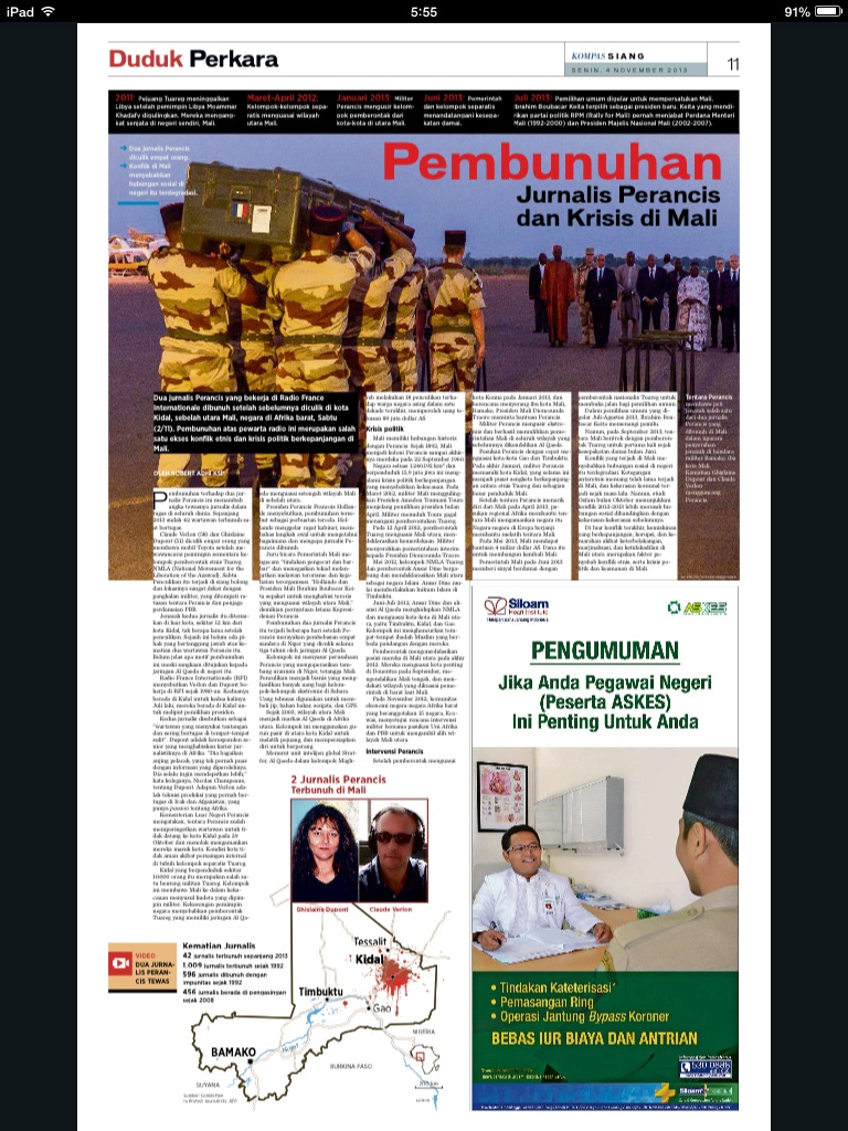 Dua jurnalis Perancis yang bekerja di Radio France Internationale dibunuh setelah sebelumnya diculik di kota Kidal, sebelah utara Mali, negara di Afrika barat, Sabtu (2/11). Pembunuhan atas pewarta radio ini merupakan salah satu ekses konflik etnis dan krisis politik berkepanjangan di Mali.