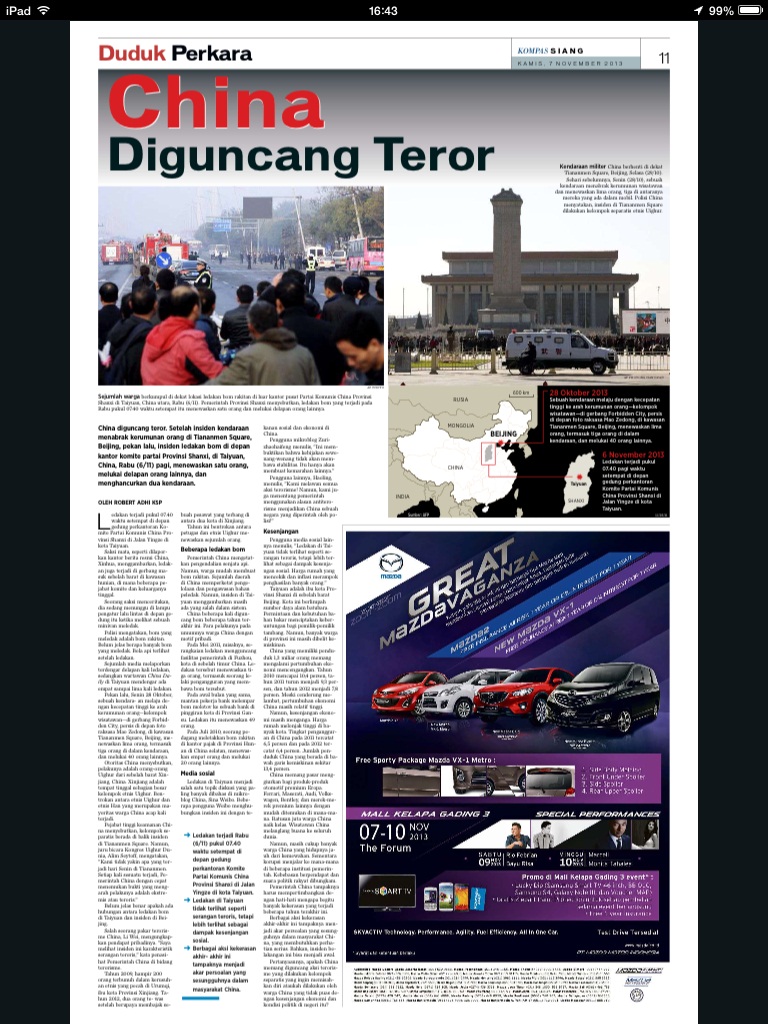 China diguncang teror. Setelah insiden kendaraan menabrak kerumunan orang di Tiananmen Square, Beijing, pekan lalu, insiden ledakan bom di depan kantor komite partai Provinsi Shanxi, di Taiyuan, China, Rabu (6/11) pagi, menewaskan satu orang, melukai delapan orang lainnya, dan menghancurkan dua kendaraan.