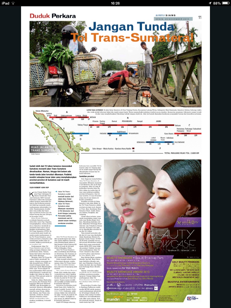 Ketua Umum Badan Pengurus Pusat Gabungan Pelaksana Konstruksi Nasional Indonesia (BPP Gapensi) Soeharsojo pekan lalu menyampaikan harapan masyarakat Sumatera dan berharap pemerintah tidak lagi menunda-nunda pembangunan infrastruktur tersebut. Bagaimanapun, kondisi jalan yang mulus dan bagus akan membantu kelancaran distribusi barang dan jasa (Kompas, 14 November 2013).