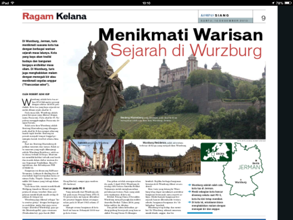 DI Wurzburg, Jerman, turis menikmati suasana kota tua dengan berbagai warisan sejarah masa lalunya. Kota yang kaya akan tradisi budaya dan bangunan bergaya arsitektur masa silam. Di Wurzburg, turis juga menghabiskan malam dengan meneguk bir atau menikmati segelas anggur (”Franconian wine”).