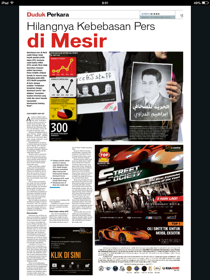 KEBEBASAN pers di Mesir sudah hilang. Sejak terjadi gejolak politik tahun 2011, terutama sejak kudeta militer 2013, jurnalis Mesir tidak lagi bebas menyampaikan laporannya. Kasus terakhir, delapan jurnalis Al Jazeera yang ditangkap pada akhir 2013 diadili pengadilan di Kairo dengan tuduhan ”melakukan konspirasi dengan kelompok teroris” dan didakwa ”menyebar- luaskan informasi yang salah dan rumor kepada masyarakat internasional tentang Mesir”.