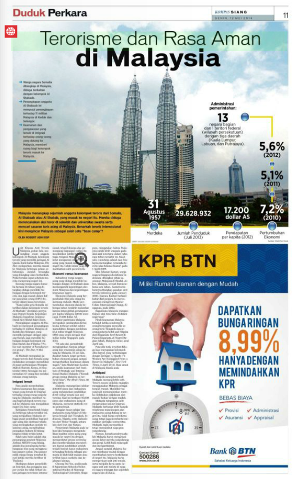 ”Di satu sisi, pemerintah menginginkan banyak pelajar asing dan wisatawan asing datang ke Malaysia. Di sisi lain, disadari bahwa target pertumbuhan ekonomi jangan sampai mengorbankan keamanan dalam negeri,” kata Shahriman Lockman, analis keamanan dari Institute of Strategic and International Studies Malaysia (”Somali group eyeing Malaysia as terrorist base”, The Strait Times, 10 Mei 2014).