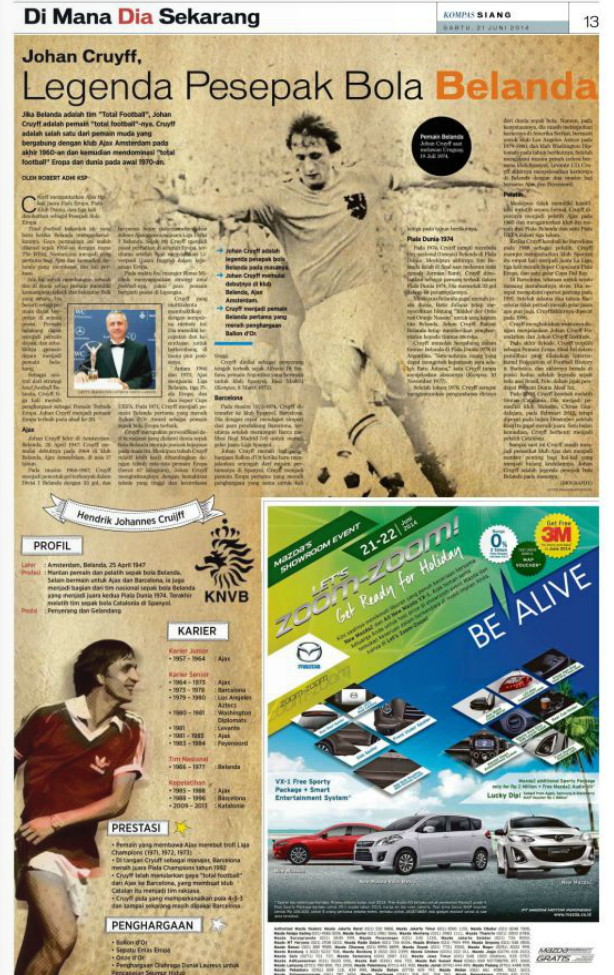 Cruyff dinilai sebagai penyerang tengah terbaik sejak Alfredo Di Stefano, pemain Argentina yang bermain untuk klub Spanyol, Real Madrid (Kompas, 8 Maret 1972).