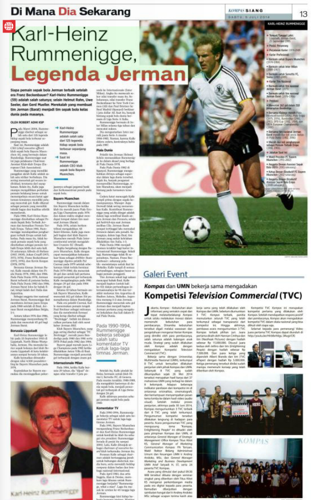 Siapa pemain sepak bola Jerman terbaik setelah era Franz Beckenbauer? Karl-Heinz Rummenigge (59) adalah salah satunya; selain Helmut Rahn, Uwe Seeler, dan Gerd Mueller. Merekalah yang membuat tim Jerman (Barat) menjadi tim sepak bola kelas dunia pada masanya.