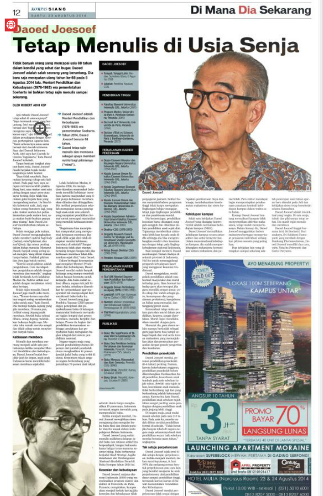 Tidak banyak orang yang mencapai usia 88 tahun dalam kondisi yang sehat dan bugar. Daoed Joesoef adalah salah seorang yang beruntung. Dia baru saja merayakan ulang tahun ke-88 pada 8 Agustus 2014 lalu. Menteri Pendidikan dan Kebudayaan (1978-1983) era pemerintahan Soeharto ini bahkan tetap rajin menulis sampai sekarang.