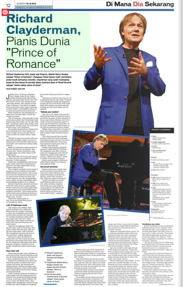 Richard Clayderman (60), pianis asal Perancis, dijuluki Nancy Reagan sebagai ”Prince of Romance” (Pangeran Cinta) karena mahir memainkan aneka musik bernuansa romantis. Clayderman yang sudah melanglang buana ke lima benua itu tercatat dalam Guinness Book of World Records sebagai ”pianis paling sukses di dunia”.