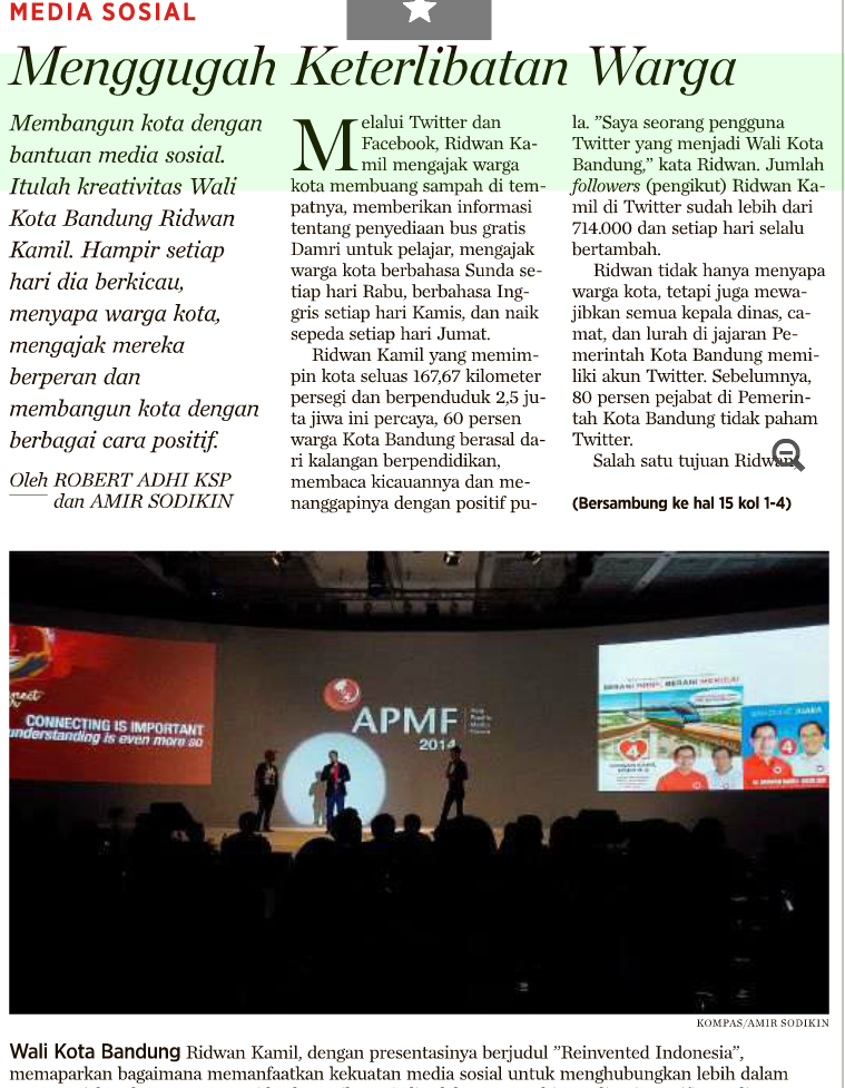 Salah satu tujuan Ridwan, agar pejabat Pemerintah Kota Bandung menyerap aspirasi warga kota. Apabila ada warga menyampaikan keluhan tentang layanan publik, Ridwan langsung meminta jajarannya menanggapi dan melakukan aksi. ”Sebelum warga kota menyampaikan terima kasih, saya anggap persoalan belum beres,” cerita Ridwan Kamil dalam Asia Pacific Media Forum (APMF) 2014 di Bali Nusa Dua Convention Center, Bali, Sabtu (20/9) pekan lalu. APMF yang bertema ”Connect Deeper” menghadirkan para pembicara pakar dalam berbagai bidang yang berkaitan dengan era digital.