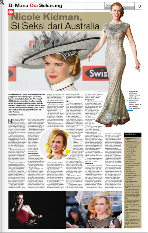 Nicole Kidman (47) adalah aktris dan produser film yang pernah meraih penghargaan Oscar untuk kategori Aktris Terbaik dalam film ”The Hours” (2002). Mantan istri bintang film Tom Cruise itu pernah dinobatkan sebagai perempuan Australia terkaya di bawah usia 40 tahun oleh majalah bisnis Australia ”Business Review Weekly” pada Agustus 2004. Pada saat itu, kekayaan Kidman 155 juta dollar Australia.
