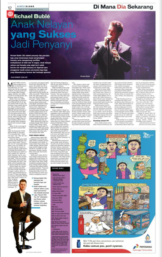 MICHAEL Bublé (39) adalah penyanyi dan pencipta lagu yang memenangi empat penghargaan Grammy serta mengantongi sertifikat multiplatinum di lebih dari 15 negara. Anak nelayan salmon asal Kanada yang sejak kecil sudah bercita-cita menjadi penyanyi ini digemari para penggemar musik semua usia karena lagu-lagu yang dibawakannya berasal dari berbagai generasi.