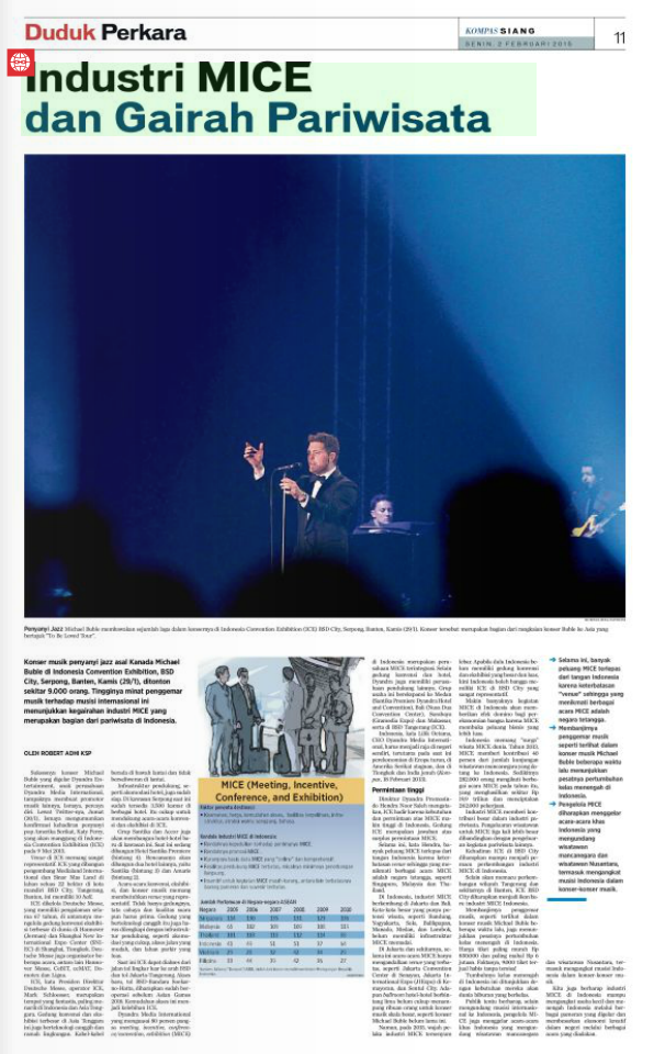 Konser musik penyanyi jazz asal Kanada Michael Buble di Indonesia Convention Exhibition, BSD City, Serpong, Banten, Kamis (29/1), ditonton sekitar 9.000 orang. Tingginya minat penggemar musik terhadap musisi internasional ini menunjukkan kegairahan industri MICE yang merupakan bagian dari pariwisata di Indonesia.