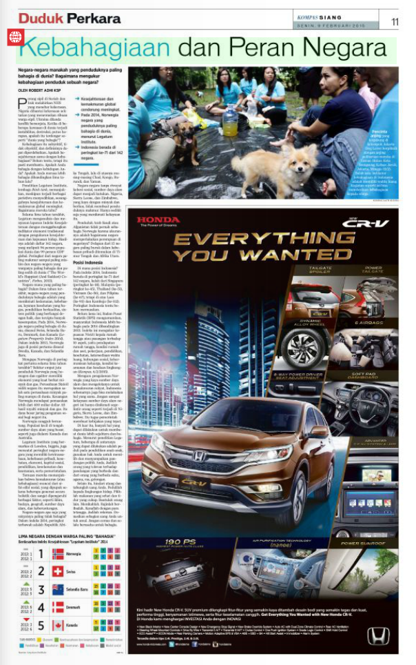 Belum lama ini, Badan Pusat Statistik (BPS) mengumumkan, masyarakat Indonesia lebih bahagia pada 2014 dibandingkan 2013. Indeks ini mengukur kepuasan 70.631 kepala rumah tangga atau pasangan terhadap 10 aspek, yaitu pendapatan rumah tangga, kondisi rumah dan aset, pekerjaan, pendidikan, kesehatan, ketersediaan waktu luang, hubungan sosial, keharmonisan keluarga, kondisi keamanan dan keadaan lingkungan (Kompas, 6/2/2015).