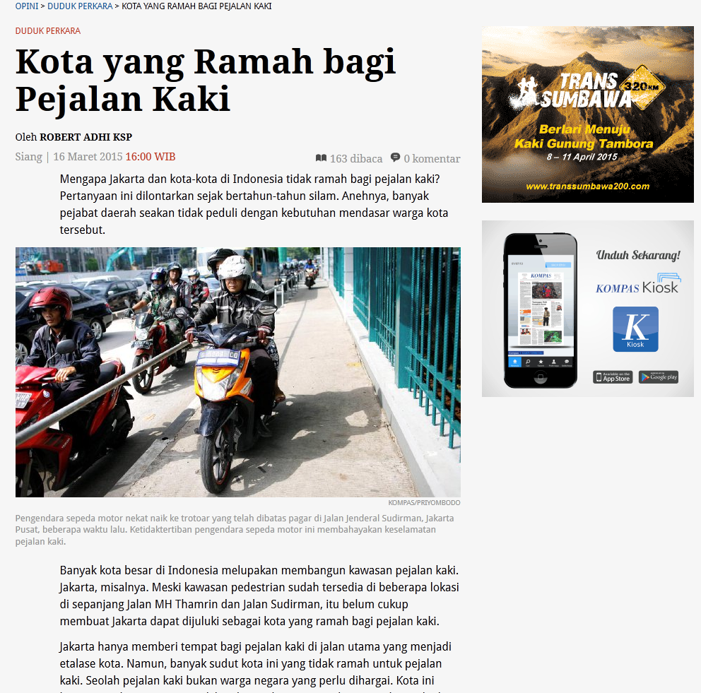 Pejalan kaki belum mendapat tempat terhormat di kota ini. Lihatlah, misalnya, ketika para pengguna kereta rel listrik commuter line keluar dari stasiun-stasiun. Apakah mereka dapat berjalan kaki dengan leluasa atau harus bersusah payah mencapai halte atau berjalan kaki di trotoar yang sudah diokupasi pedagang kaki lima ataupun menjadi tempat tidur tunawisma?
