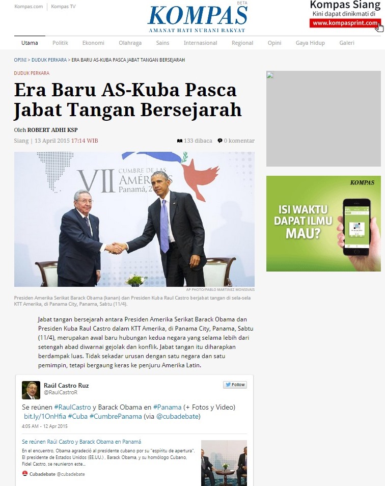 Jabat tangan bersejarah antara Presiden Amerika Serikat Barack Obama dan Presiden Kuba Raul Castro dalam KTT Amerika, di Panama City, Panama, Sabtu (11/4), merupakan awal baru hubungan kedua negara yang selama lebih dari setengah abad diwarnai gejolak dan konflik. Jabat tangan itu diharapkan berdampak luas. Tidak sekadar urusan dengan satu negara dan satu pemimpin, tetapi bergaung keras ke penjuru Amerika Latin.