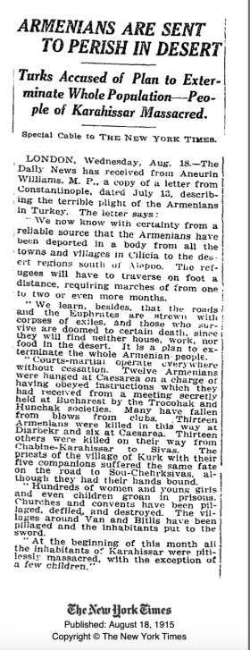 Media-media Amerika saat itu enggan menggunakan kata “genosida” untuk melukiskan kejahatan kemanusiaan yang terjadi di Turki. Presiden AS Ronald Reagan sampai Barack Obama masih melihat pentingnya hubungan dengan sekutunya, Turki.