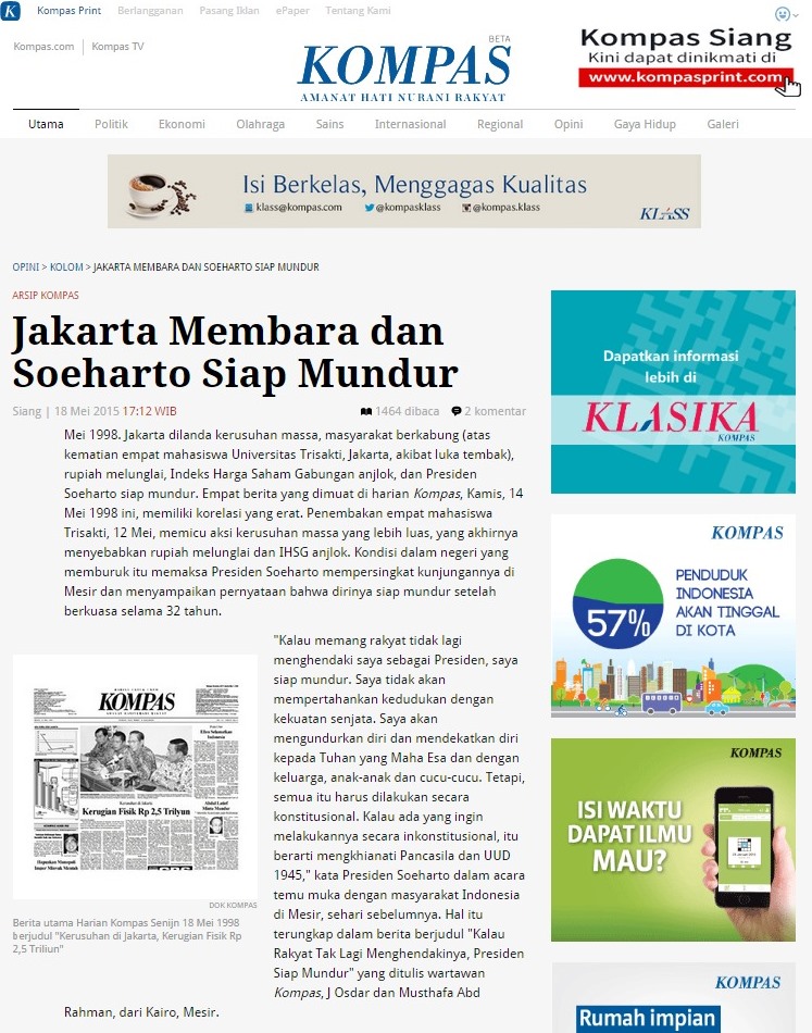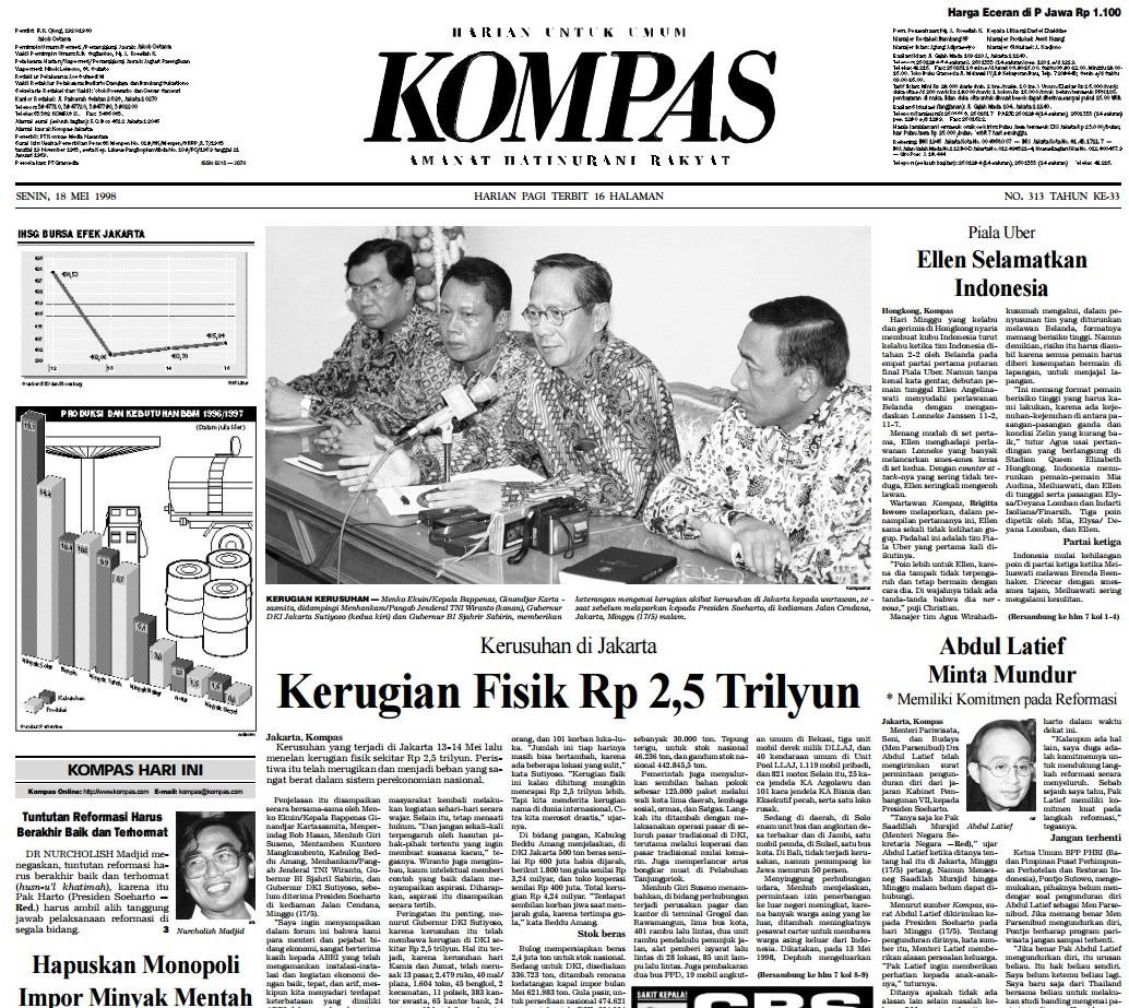 Mei 1998. Jakarta dilanda kerusuhan massa, masyarakat berkabung (atas kematian empat mahasiswa Universitas Trisakti, Jakarta, akibat luka tembak), rupiah melunglai, Indeks Harga Saham Gabungan anjlok, dan Presiden Soeharto siap mundur. Empat berita yang dimuat di harian Kompas, Kamis, 14 Mei 1998 ini, memiliki korelasi yang erat. Penembakan empat mahasiswa Trisakti, 12 Mei, memicu aksi kerusuhan massa yang lebih luas, yang akhirnya menyebabkan rupiah melunglai dan IHSG anjlok. Kondisi dalam negeri yang memburuk itu memaksa Presiden Soeharto mempersingkat kunjungannya di Mesir dan menyampaikan pernyataan bahwa dirinya siap mundur setelah berkuasa selama 32 tahun.
