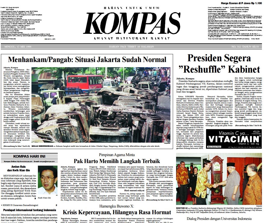 Kompas, 17 Mei 1998, menurunkan berita “Situasi Jakarta Sudah Normal”. Situasi Ibu Kota sejak Sabtu, 16 Mei, dapat dikendalikan dan aman. Namun, Wiranto meminta seluruh masyarakat terus meningkatkan kewaspadaan dan mengefektifkan pengamanan lingkungan bersama aparat.