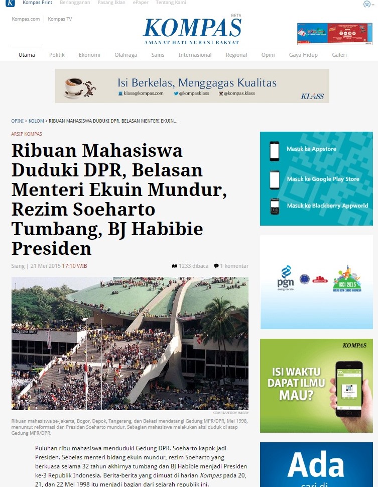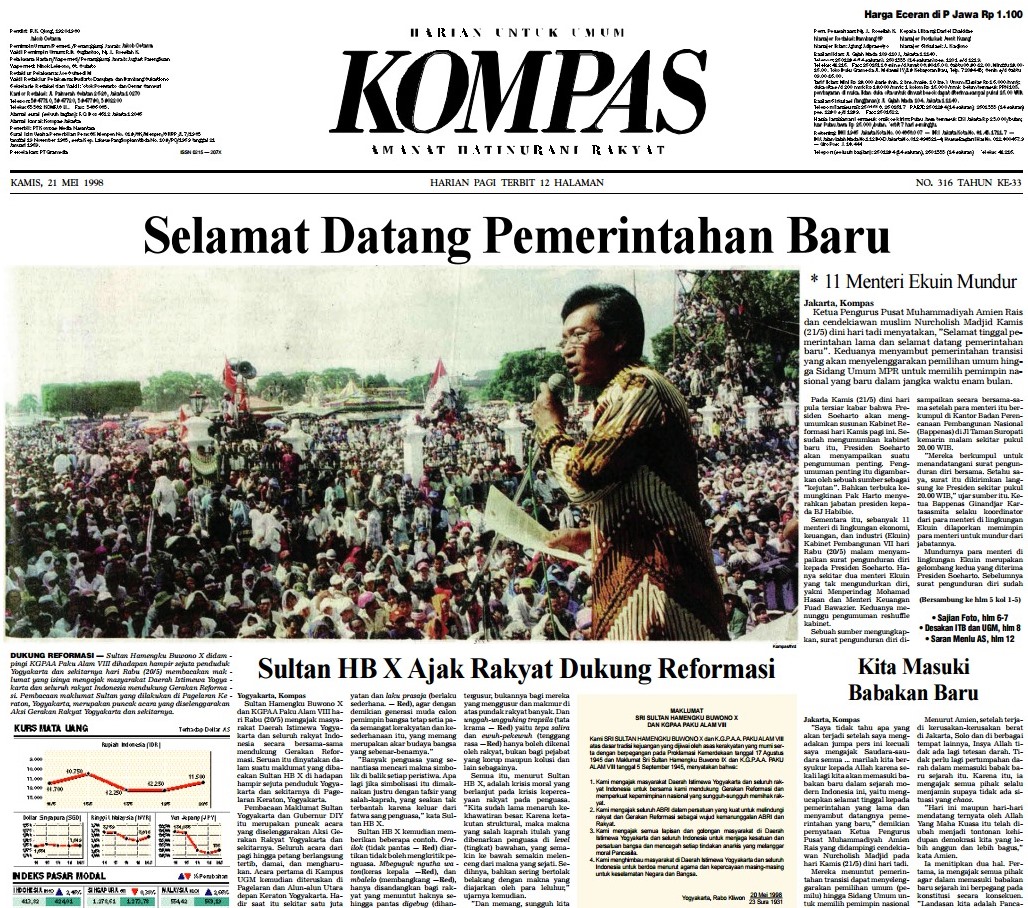 Puluhan ribu mahasiswa menduduki Gedung DPR. Soeharto kapok jadi Presiden. Sebelas menteri bidang ekuin mundur, rezim Soeharto yang berkuasa selama 32 tahun akhirnya tumbang dan BJ Habibie menjadi Presiden ke-3 Republik Indonesia. Berita-berita yang dimuat di harian Kompas pada 20, 21, dan 22 Mei 1998 itu menjadi bagian dari sejarah republik ini.