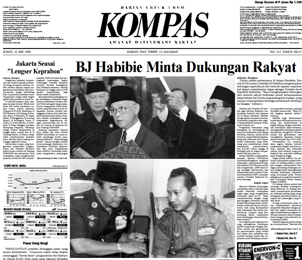 Berita utama harian Kompas, Jumat, 22 Mei 1998, berjudul “BJ Habibie Minta Dukungan Rakyat”. Habibie menjadi Presiden RI setelah Kamis, 21 Mei 1998, pagi harinya Soeharto menyatakan berhenti dari jabatan itu di Istana Merdeka. Habibie mengucapkan sumpah untuk jadi presiden yang baru dari negeri berpenduduk keempat terbanyak di dunia ini.