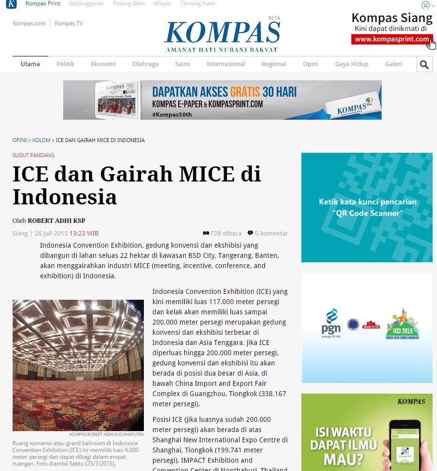 Presiden Joko Widodo meresmikan ICE pada Selasa 4 Agustus. Ini sinyal benderang bahwa Presiden mendukung penuh industri MICE, termasuk di dalamnya industri kreatif. Kehadiran ICE tentu membanggakan Indonesia karena gedung ICE termasuk yang terbesar di Asia. Berbagai pameran nasional dan internasional akan digelar di gedung ini dan akan menggairahkan industri MICE. Semoga masyarakat merasakan efek domino dan mendapatkan nilai tambah dari kehadiran ICE.