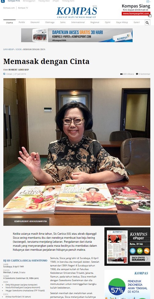 Ketika usianya masih lima tahun, Sis Cartica (66) atau akrab dipanggil Sisca sering membantu ibu dan neneknya membuat kue keju kering (kastengel), terutama menjelang Lebaran. Pengalaman dari dunia masak yang menyenangkan pada masa kecilnya itu membekas dalam hidupnya dan membuat perjalanan hidupnya penuh makna.