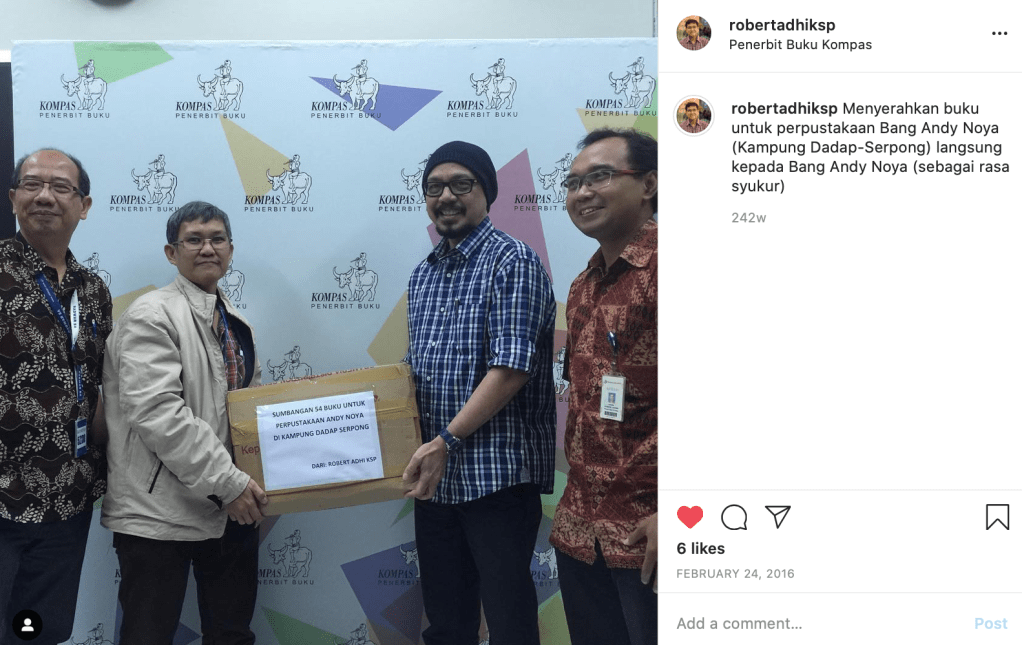 Ketika aku mendapatkan royalti buku “Andy Noya: Kisah Hidupku” tahun 2016, aku membeli buku-buku terbaru terbitan Penerbit Buku Kompas, dan menyerahkan satu kardus buku-buku tersebut langsung kepada Bang Andy Noya, untuk kemudian menjadi koleksi perpustakaan di Kampung Dadap, Serpong, Tangerang Selatan — yang “dibina” Bang Andy. (Sejak itu, royalti buku ini selalu mengalir. Hingga tahun 2020, buku ini sudah memasuki cetakan ke-23. Percaya atau tidak, kebaikan yang kita lakukan selalu mendatangkan kembali rezeki karena Semesta memberi dukungan).
