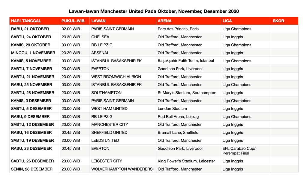 Manchester United pada musim 2020-2021 kembali ke zona Liga Champions, setelah finish di posisi ketiga Liga Inggris musim 2019-2020. Undian Liga Champions yang digelar 1 Oktober lalu menempatkan Manchester United di grup keras. Setan Merah satu grup dengan juara Liga Perancis (Ligue 1), Paris Saint-Germain (PSG); RassenBallsport Leipzig atau RB Leipzig yang finish di posisi ke-3 Bundesliga pada musim 2019-2020; dan juara Liga Turki, Istanbul Basaksehir FK.