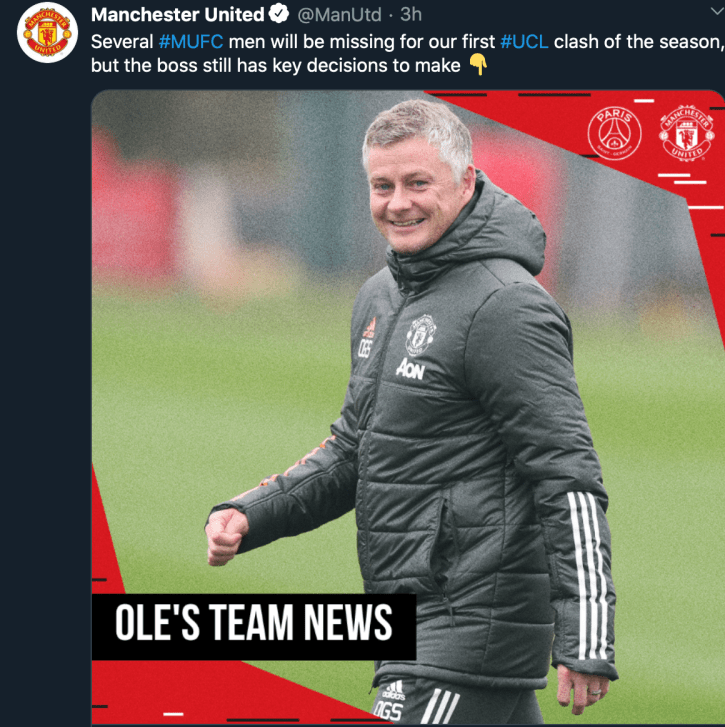Pelatih Manchester United, Ole Gunnar Solskjaer dalam keterangan pers hari Selasa (20/10/2020) dinihari WIB mengonfirmasi absennya lima pemain dalam laga perdana MU di kandang PSG. Lima pemain tersebut adalah Harry Maguire, Edinson Cavani, Mason Greenwood, Eric Bailly, dan Jesse Lingard.