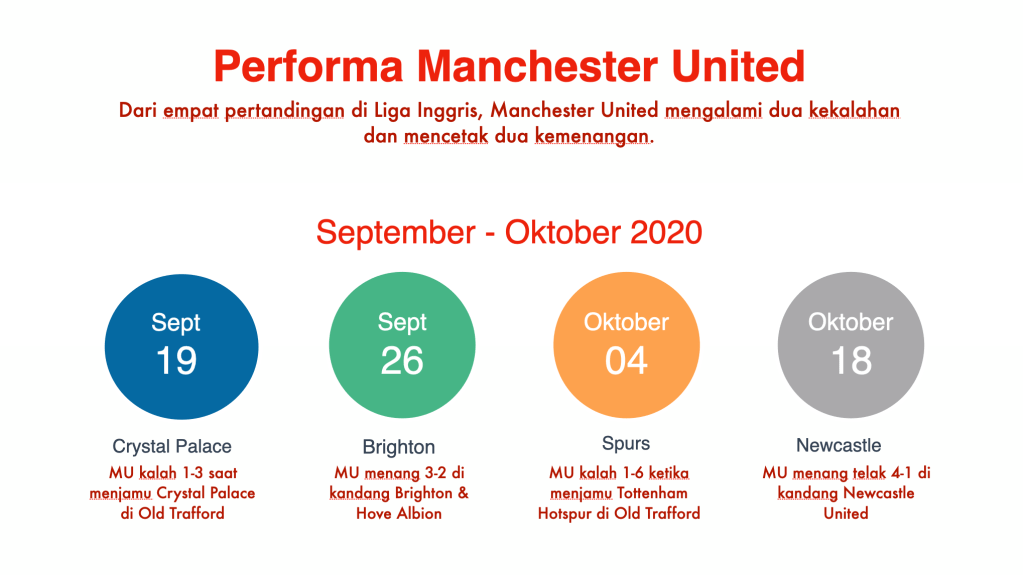 Di Liga Inggris, Manchester United kalah 1-3 dalam pertandingan perdana saat menjamu Crystal Palace, 19 September; dan kalah 1-6 dalam pertandingan ketiga saat menjamu Tottenham Hotspur, 4 Oktober. Namun dalam dua pertandingan lainnya, Manchester United unggul tipis 3-2 atas Brighton & Hove Albion, 26 September; dan menang telak 4-1 atas Newcastle United, 18 Oktober lalu.