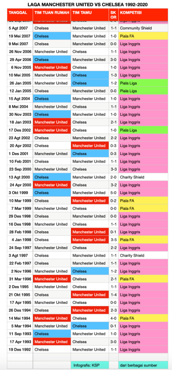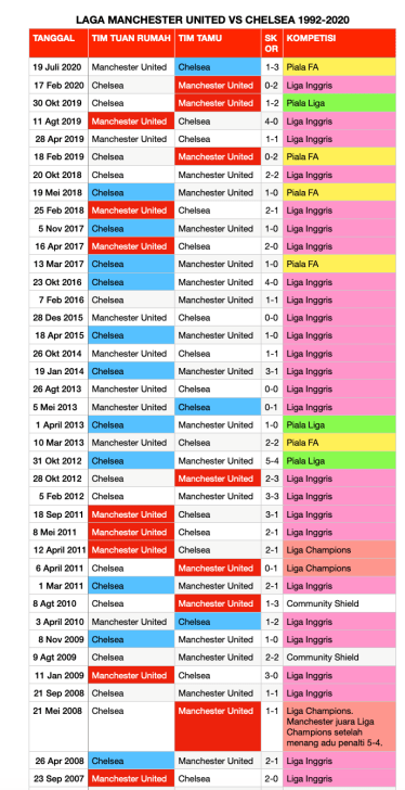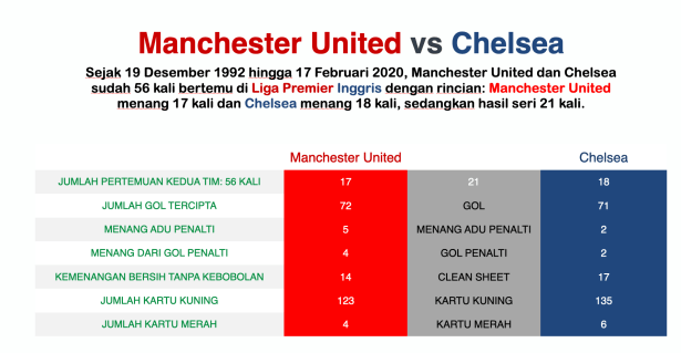 Pertandingan Manchester United vs Chelsea adalah pertarungan klasik. Dari 56 kali pertemuan antara kedua tim, Manchester United menang 17 kali, Chelsea 18 kali, dan hasil seri 21 kali. MU memasukkan 72 gol ke gawang Chelsea, sedangkan Chelsea 71 gol ke gawang MU.