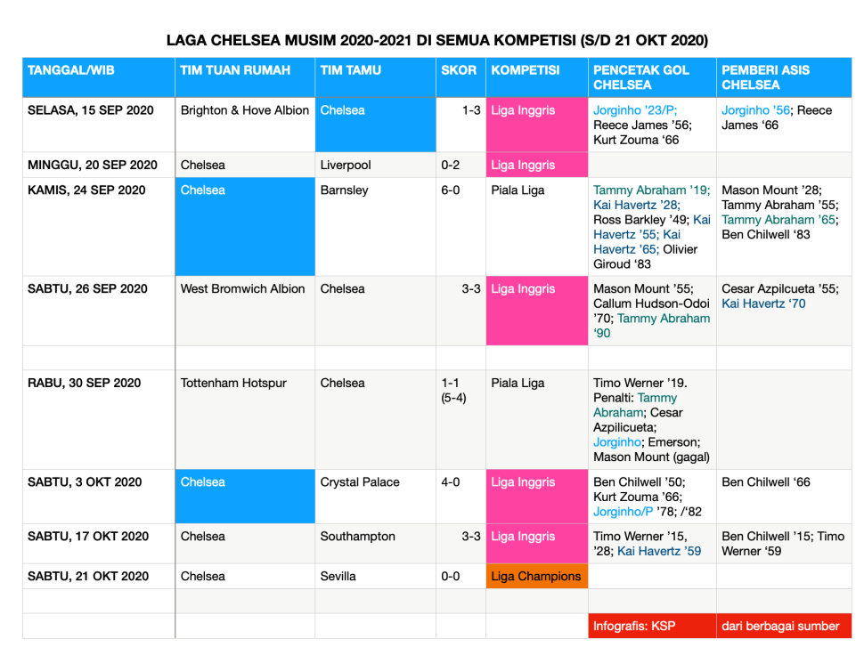 Di Liga Inggris, sejauh ini Chelsea menang atas Brighton & Hove Albion dan Crystal Palace; kalah dari Liverpool; dan bermain imbang dengan West Bromwich Albion dan Southampton. Di Piala Carabao/EFL, perjalanan Chelsea dihentikan Tottenham Hotspur. Di Liga Champions, Chelsea bermain imbang tanpa gol saat menjamu Sevilla (juara Liga Europa musim lalu) di Stamford Bridge.
