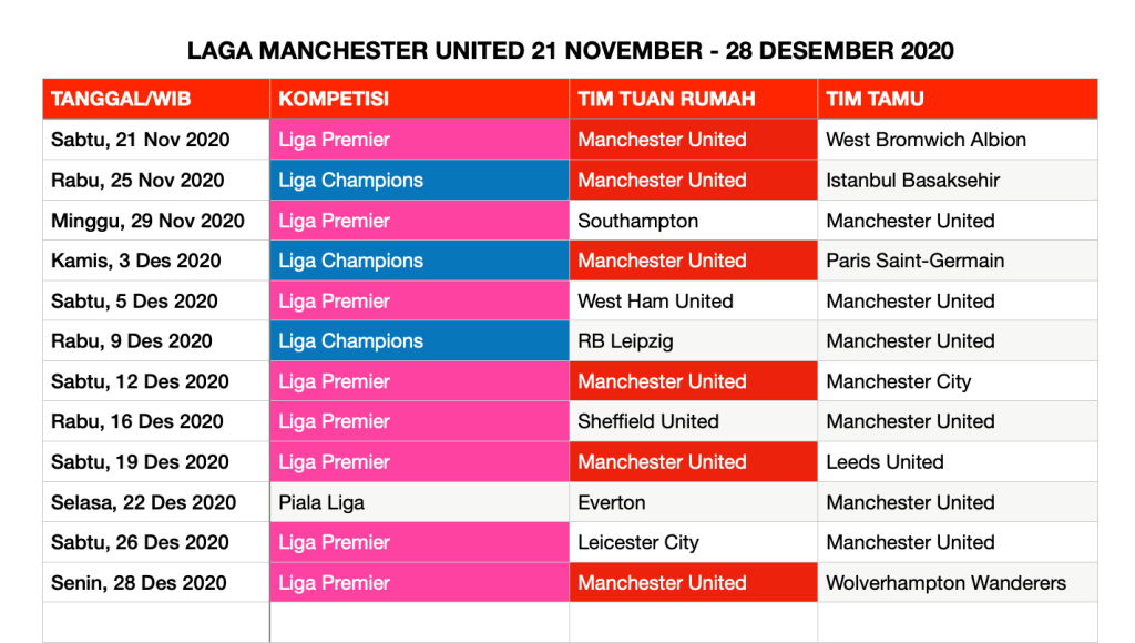 Pada Sabtu 21 November malam, menjamu West Bromwich Albion di Old Trafford. Empat hari kemudian, Rabu 25 November, The Red Devils menjadi tuan rumah pertandingan vs Istanbul Basaksehir dalam lanjutan Liga Champions. Empat hari setelah itu, Minggu 29 November malam, Manchester United akan bertandang ke kandang Southampton — yang pada pekan ini menjadi pemimpin klasemen sementara Liga Premier.