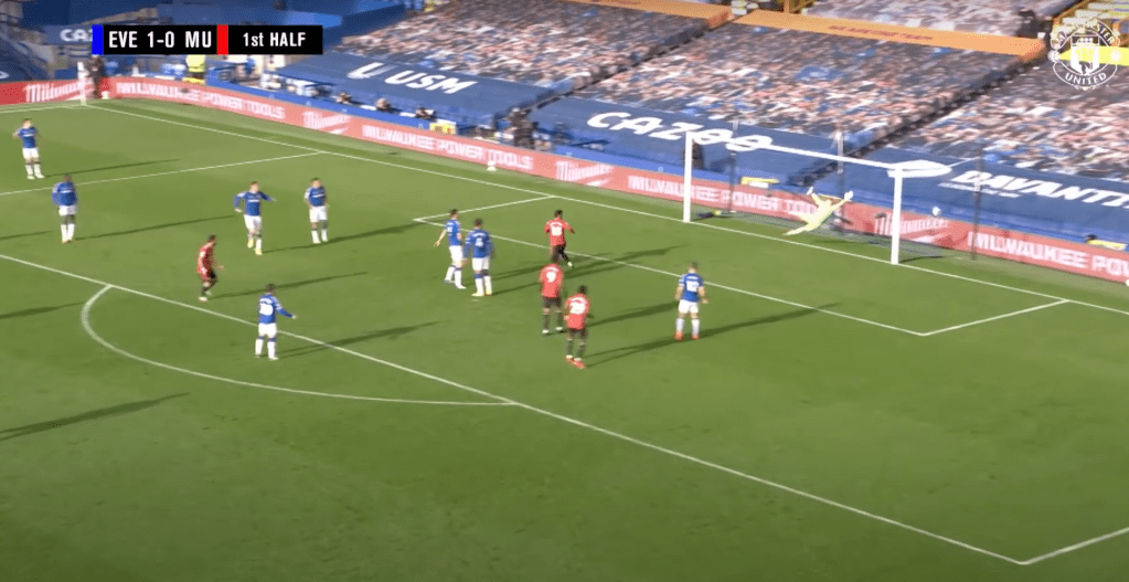 Enam menit kemudian, pada menit ke-25, gelandang MU asal Portugal, Bruno Fernandes mencetak gol balasan lewat tandukannya tepat di depan gawang Everton setelah menerima asis dari Luke Shaw. Gol ini tercipta berkat umpan Scott McTominay, yang kemudian disambut Luke Shaw yang memberi umpan lambung ke depan gawang Everton. Bruno yang tidak dikawal pemain Everton, langsung menanduk bola ke dalam gawang, tanpa dapat dijangkau kiper Jordan Pickford.