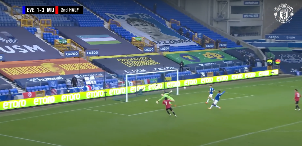 Gol ketiga ManUnited dicetak Edinson Cavani setelah menyambut asis dari Bruno Fernandes yang menggiring bola dari tengah lapangan pada injury time, menit ke 90 +5. Bruno Fernandes sebenarnya bisa saja mencetak gol ketiganya tetapi dia tidak egois. Dia memberi asis kepada Cavani yang berada di sebelah kirinya. Cavani dengan tenang mengarahkan bola ke sudut kanan Pickford. Ini merupakan gol pertama pemain asal Uruguay untuk ManUnited setelah berlabuh ke Old Trafford Oktober lalu. Cavani merupakan pemain kedua asal Uruguay yang mencetak gol untuk The Red Devils, mengikuti jejak Diego Forlan.