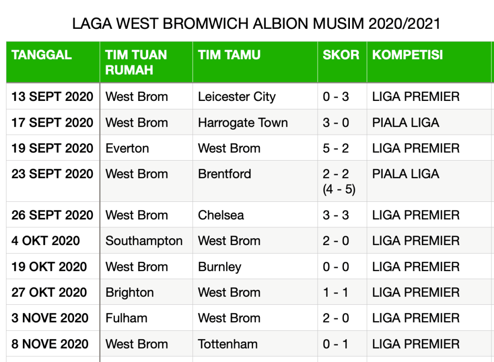 The Baggies masih mencari kemenangan pertama pada musim ini. Saat ini WBA berada di posisi ke-18 setelah kalah lima kali dan seri tiga kali dari delapan pertandingan awal.