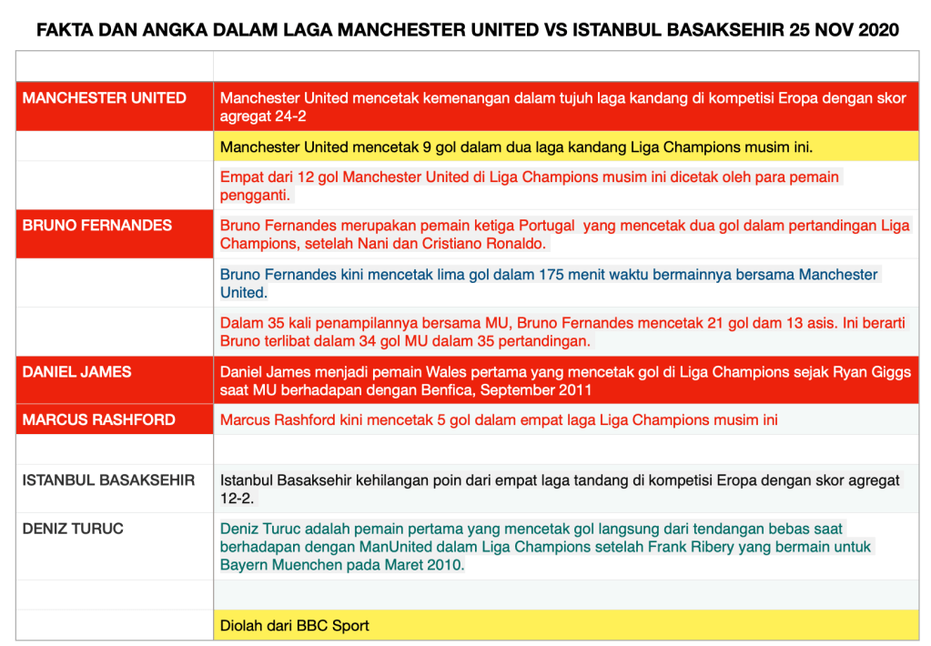 Dengan kemenangan ini, MU mencetak tujuh laga terakhir di kompetisi Eropa dengan skor agregat 24-2. Sedangkan Istanbul Basaksehir kehilangan poin dari empat laga tandang di kompetisi Eropa dengan skor agregat 12-2.