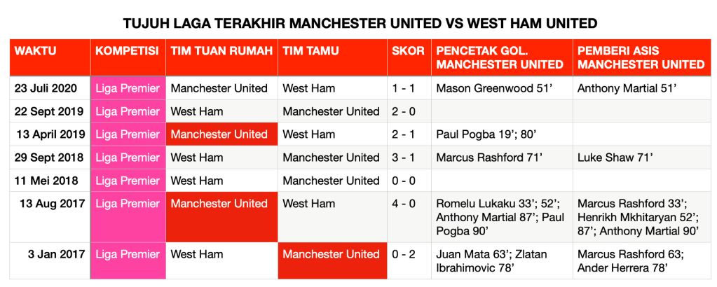 Pertandingan ini akan menjadi laga tandang ke-25 Manchester United vs West Ham selama era Liga Premier dan kunjungan kelima MU ke Stadion London — sejak menggantikan Upton Park sebagai kandang baru The Hammers pada 2016. Meskipun ManUnited memenangkan sembilan pertandingan dan West Ham lima kali menang, namun The Red Devils belum meraih tiga poin di East London sejak musim 2016/2017.