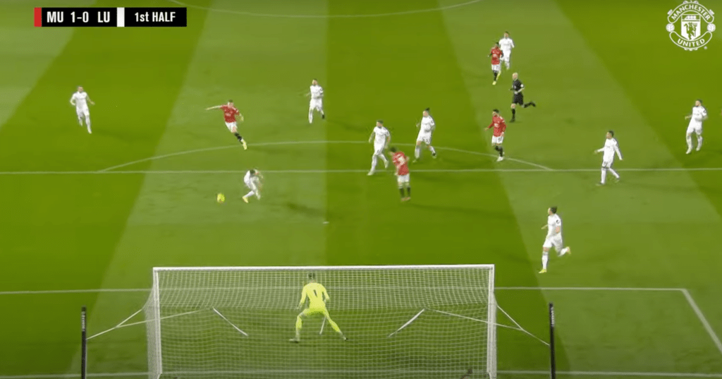 Gerakan cerdas dari Martial, umpan dan kecepatan berlari yang brilian. Menerima umpan balik dari Martial, McTominay menendang bola langsung ke gawang Leeds.
