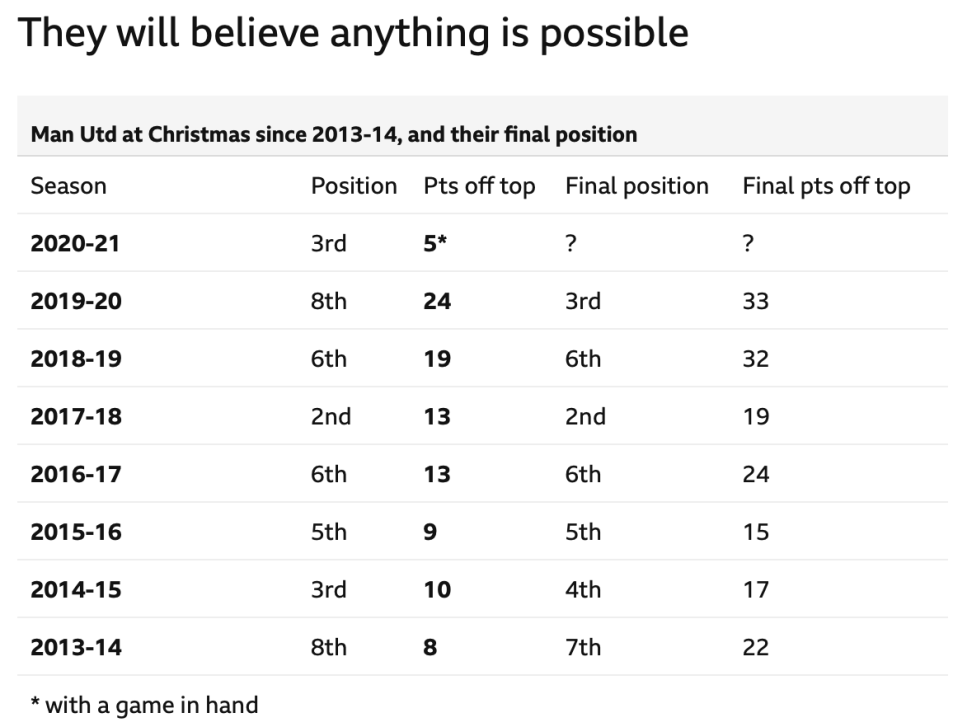 Setiap kali MU kalah, tanggung jawab dilimpahkan sepenuhnya ke Solskjaer dan pengamat meminta Ole “pergi”, seakan-akan itu hal terburuk yang pernah ada. Sekarang saatnya memberi Ole pujian. MU belum pernah berada di puncak klasemen saat Natal sejak Sir Alex Ferguson mengundurkan diri pada 2013. Tetapi Ole melakukannya pada tahun ini. Ini tanda kemajuan MU dan bukti mereka sudah menuju arah yang benar setelah dua tahun bersama Solskjaer sebagai manajer.