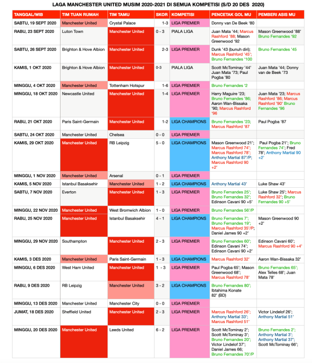 Kemenangan Manchester United atas Leeds United dengan skor telak 6-2 di Old Trafford, Minggu (20/12/2020) menjelang tengah malam WIB, membawa The Red Devils naik ke posisi ketiga klasemen sementara Liga Premier. ManUnited membuka peluang untuk mengejar perebutan gelar juara liga musim ini.
