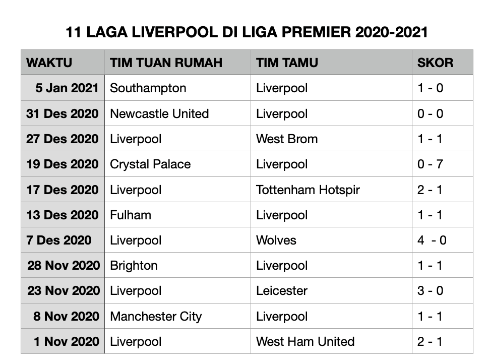 Sementara itu tim asuhan Juergen Klopp hanya memenangkan empat dari 10 pertandingan terakhir mereka. Bahkan dalam tiga laga terakhir, Liverpool gagal meraih tiga poin. Dalam pertandingan terakhir, Liverpool malah bertekuk lutut di kaki Southampton 0-1 berkat gol tunggal mantan striker Liverpool, Danny Ings.