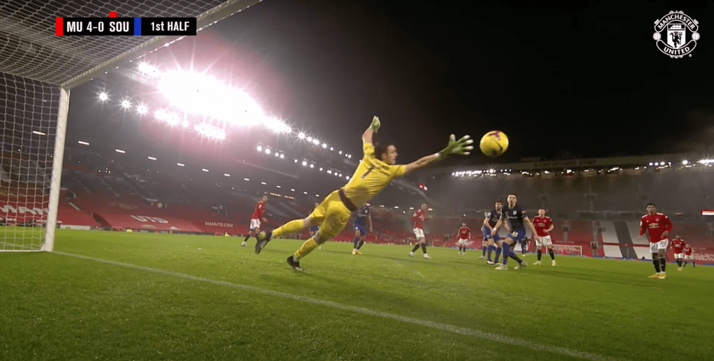 Kiper David de Gea sempat menyelamatkan gawang MU dari tendangan bebas James Ward-Prowse.