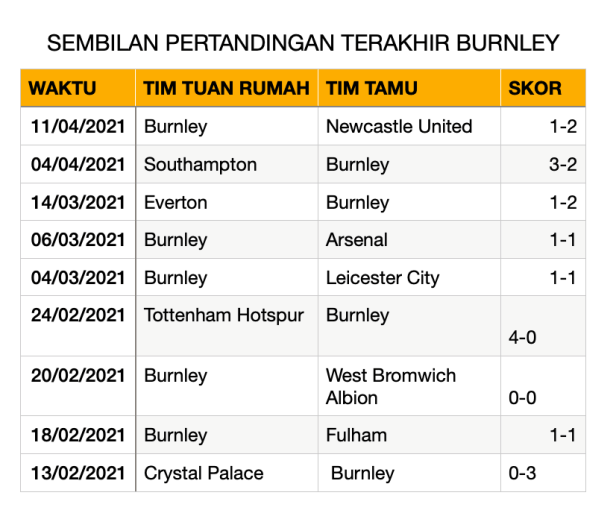 Burnley yang hanya menang satu kali dari delapan pertandingan terakhirnya, saat ini berada di peringkat ke-17 klasemen sementara Liga Premier, mengoleksi 33 poin dari 31 pertandingan. Sean Dyche yang menjadi pelatih Burnley sejak Oktober 2012, dua kali mengantarkan Burnley promosi ke Liga Premier, dan sempat mengalami relegasi di Liga Championship pada musim 2014/2015. Pada 2018, Dyche berhasil membawa Burnley finish di peringkat ke-7 Liga Premier, posisi terbaik klub itu sejak 1974.