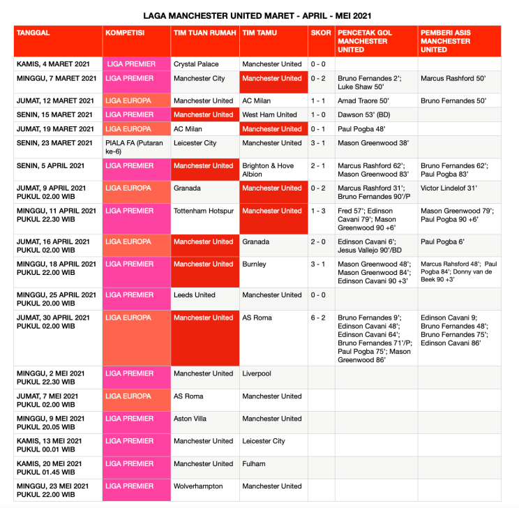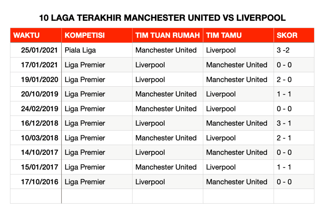 Manchester United akan menjamu Liverpool, Minggu (2/5/2021) malam WIB dalam pertandingan pekan ke-34 Liga Premier. ManUnited saat ini berada di posisi ke-2 dan di zona Liga Champions musim 2021/2022. Sebaliknya Liverpool berada di posisi ke-6, berupaya menembus empat besar meski persaingan dengan Chelsea dan West Ham makin ketat. Manchester United tidak terkalahkan dalam 13 pertandingan terakhir Liga Premier. Adapun Liverpool belum pernah kalah dalam lima pertandingan terakhir.