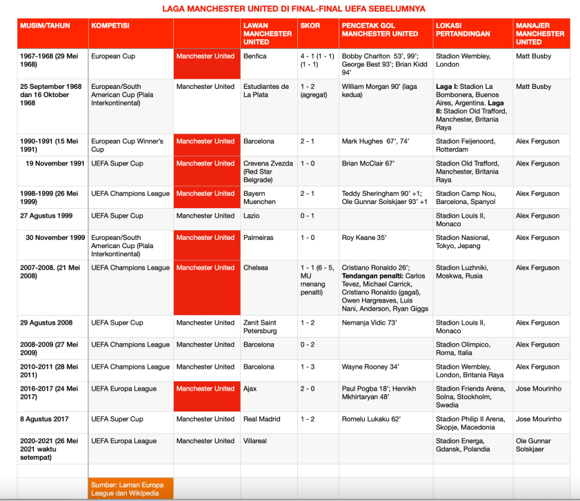 Nama-nama pemain Manchester United yang disiapkan untuk bertanding di final Liga Europa di Gdansk, Polandia, sudah diumumkan. Tercatat ada 26 nama yang siap bertarung untuk merebut trofi Liga Europa musim 2020/2021.