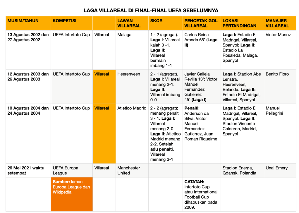 Lawan Manchester United di final Liga Europa adalah Villareal, klub Spanyol yang mengakhiri musim 2020/2021 di La Liga di peringkat ke-7 — hasil yang mengecewakan manajernya, Unai Emery, dan para pendukungnya. Villareal masih mendapat tempat untuk bermain di Liga Konferensi Eropa (yang baru diumumkan UEFA) —bersama Tottenham Hotspur yang juga finish di peringkat ke-7 Liga Premier.