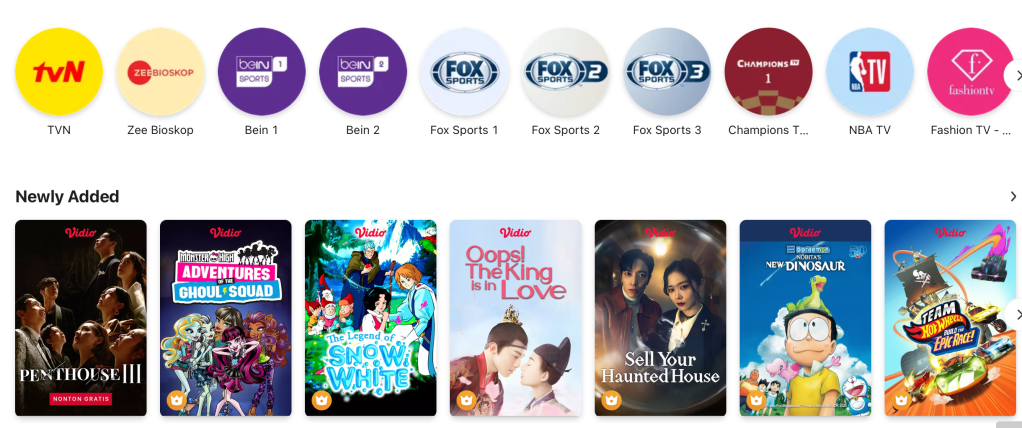 Seperti halnya Mola TV, Vidio juga menghadirkan film-film unggulan yang dapat dinikmati pelanggan, selain mengakses sejumlah stasiun TV dan stasiun radio Indonesia.