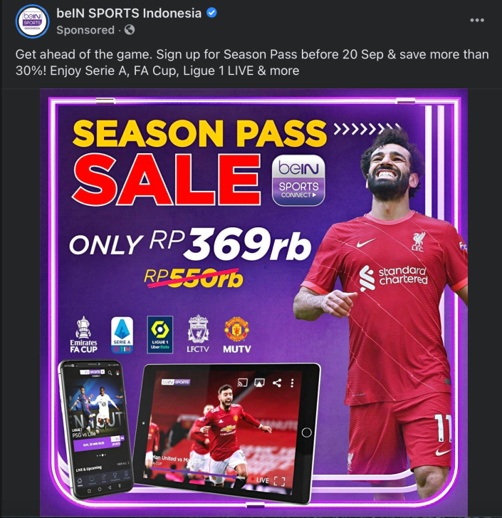 Adapun beIn Sport menawarkan pelanggan untuk mengambil promo “Season Pass” dengan tayangan eksklusif dari MUTV, Liverpool FC TV, Serie A, Ligue 1, dan FA Cup dengan biaya berlangganan Rp 369.000 per tahun (berlaku sampai 20 September 2021).