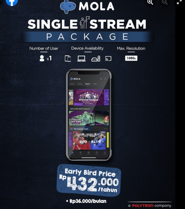 Mola TV pada Juni-Juli lalu sukses mempromosikan pertandingan Euro2020 dengan biaya hanya Rp 25.000/satu pengguna. Mola memperkenalkan biaya langganan satu tahun nonton Liga Premier dan liga-liga sepakbola lainnya dengan potongan 40 persen (sampai 13 Agustus 2021) seharga Rp 432.000 atau Rp 36.000 per bulan untuk satu pengguna (paket single stream, harga early bird) dengan resolusi maksimal 1080p.