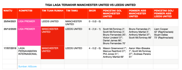 Dari kubu Leeds dikabarkan, rekrutan baru Leeds United dari Barcelona, Junior Firpo siap diturunkan dalam laga debutnya di Liga Premier. Bek sayap ini cedera dalam laga persahabatan di Loughborough tetapi siap tampil di Old Trafford. Kalvin Phillips yang bekerja keras dalam Euro 2020 lalu, siap tampil.